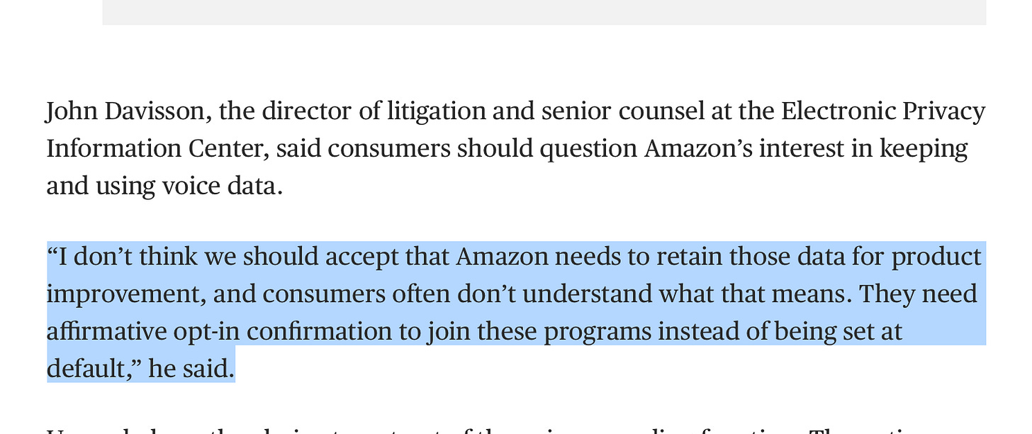 Amazon wants to use voice command data to train their Alexa AI. I won’t try to say it better than my colleague John: (NBC News)